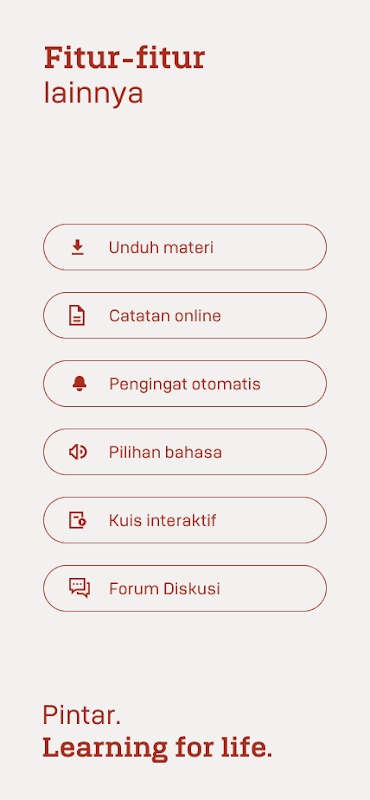 Aplikasi Pintar juga menawarkan kenyamanan belajar lewat dasbor unauk melacak progres, LMS yang dilengkapi pemutar video, kartu skor unauk mengukur performancea belajar, pembuatan catatan, dan diễn đàn diskusi.