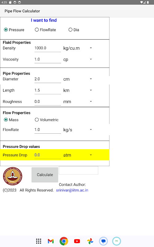 Ứng dụng này có thể tính toán độ giảm áp suất hoặc tốc độ dòng chảy hoặc đường kính ống