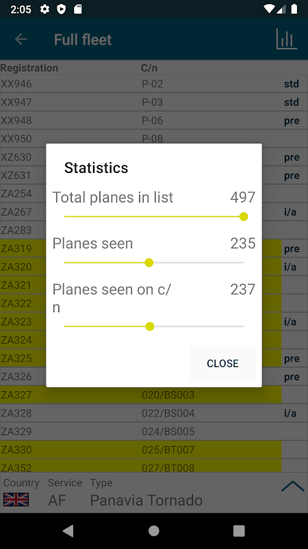 Ứng dụng này cho phép bạn truy cập trực tiếp vào cơ sở dữ liệu mặt phẳng Sp đốmmode. Tìm kiếm các máy bay cá nhân hoặc danh sách hạm đội đầy đủ. Kiểm tra thời điểm và nơi một chiếc máy bay được nhìn thấy, hoặc nơi nó có thể được tìm thấy trong một bảo tàng ngay bây giờ.
