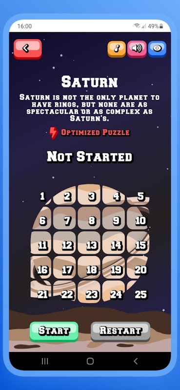 Sau khi bạn chọn xong cấp độ, hệ mặt trời khổng lồ của chúng ta sẽ xuất hiện trên màn hình của bạn, thật tuyệt phải không? Nhưng chờ đã, niềm vui vẫn chưa kết thúc. Nhấp vào bất kỳ hành tinh nào bạn muốn bắt đầu, sau khi nhấp vào nó, các mảnh ghép của hành tinh đó sẽ xuất hiện trên màn hình của bạn, nhiệm vụ của bạn là sắp xếp các mảnh ghép này và kiếm các ngôi sao. Hãy chắc chắn rằng bạn hoàn thành câu đố trong ít lần di chuyển nhất có thể để đánh bại số điểm trước đó của bạn. Giảm căng thẳng của bạn và tận hưởng nền hoạt hình hàng đêm.