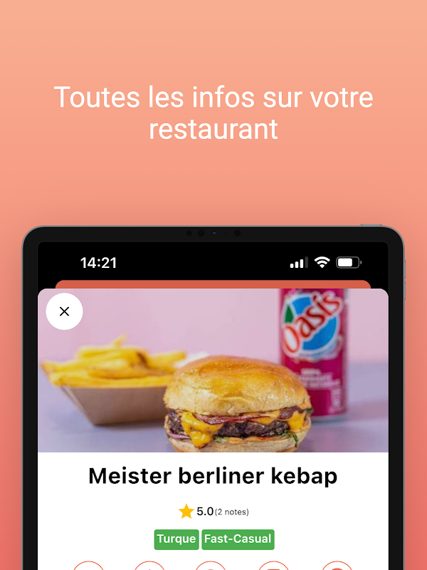 Ứng dụng này cho phép bạn xếp hạng và để lại nhận xét về các nhà hàng bạn đang thử nghiệm. Nhà hàng yêu thích của bạn không được tham khảo? Bạn có thể gửi nó cho chúng tôi để chúng tôi có thể tích hợp nó. Chúng tôi không thể chờ đợi để khám phá địa chỉ tốt của bạn. Hơn nữa, bạn có thể giữ các địa chỉ tốt nhất được tìm thấy trên ứng dụng trong danh sách mong muốn của bạn.