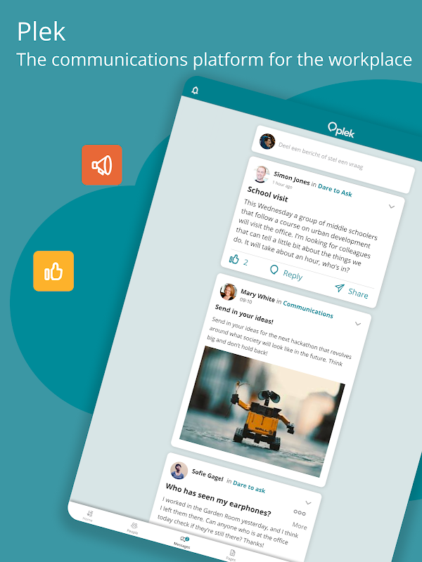 Plek là một nền tảng cộng đồng và hợp tác: dễ sử dụng, nhanh chóng, thông minh và an toàn. Một mạng nội bộ xã hội, cổng thông tin cộng đồng và nền tảng chia sẻ kiến thức, với tất cả các chức năng cần thiết: tin tức, cấu hình, nhóm, tin nhắn, lịch, tài liệu và nhắn tin. Plek giúp bạn vượt qua silo, kích thích sự hợp tác và chia sẻ kiến thức.