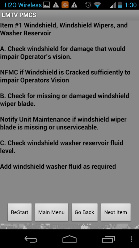 Ngoại tuyến, Ứng dụng PMCS dành cho xe quân sự cho Quân đội Hoa Kỳ, Thủy quân lục chiến Hoa Kỳ, Không quân, Lực lượng Cảnh sát Quốc gia Quân đội và Khu bảo tồn Quân đội. Không bao giờ không có hướng dẫn -10 TM nữa và phải nghe 1SG hỏi bạn "TM của bạn ở đâu?". Chỉ cần trả lời rằng bạn đang ở trong thời đại công nghệ và có nó ngay trên điện thoại thông minh của bạn. Không đời nào anh ta có thể tranh cãi được điều đó. Có danh sách kiểm tra mục PMCS với bạn ở bất cứ đâu. Cá nhân tôi chưa bao giờ ở trong một đơn vị thực sự có đủ TM để thực hiện PMCS đúng trên xe. Vì vậy, không tải về "Glitchie" App với một hình ảnh đẹp HMMWV quân đội trả hàng ngàn để có một số dân thường xây dựng. Đặc biệt là khi họ đánh vần nó HUMMVE đến ngay bây giờ. Tôi chắc chắn rằng họ đã được trả hàng ngàn để sản xuất cho quân đội. Điều này có các phương tiện quân sự phổ biến nhất như HMMWV, LMTV và Generators.