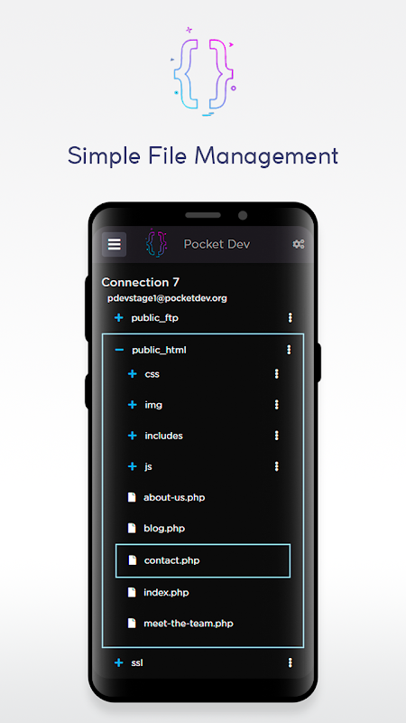Pocket Dev cung cấp các khả năng của máy khách FTP và trình soạn thảo văn bản. Kết nối với máy chủ, duyệt tập tin và chỉnh sửa bằng một quy trình quen thuộc.