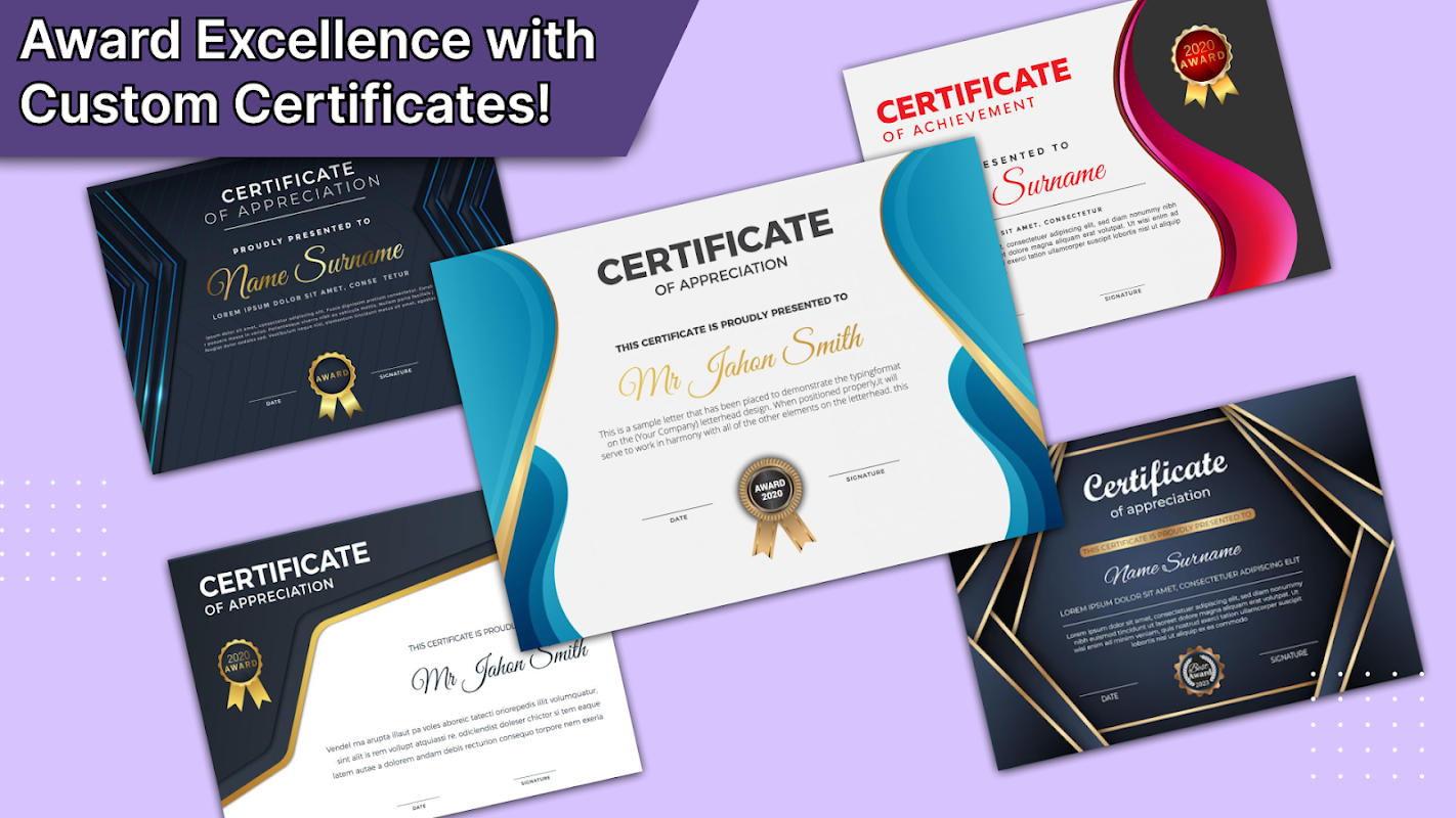🔥 Trình tạo chứng chỉ: Trình tạo chứng chỉ & Trình tạo logo cung cấp các mẫu chứng chỉ miễn phí cho tất cả các sự kiện bao gồm thực tập, bằng tốt nghiệp, thành tích, sự tham gia, chứng chỉ trường học và tốt nghiệp. Sử dụng trình tạo logo, tạo và thêm logo của tổ chức bạn vào chứng chỉ.