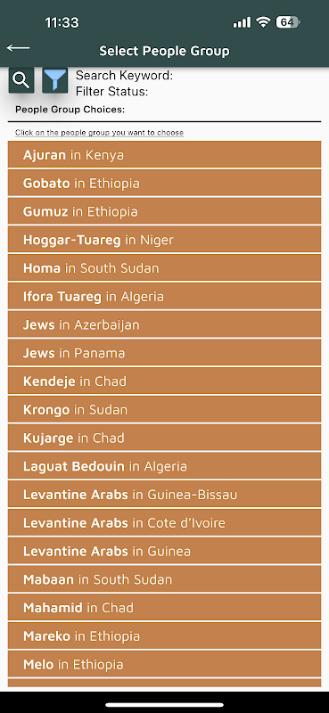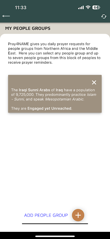 Bạn có bao giờ tự hỏi làm thế nào bạn cũng có thể tham gia vào công việc mà Đức Chúa Trời đang làm giữa các nhóm người ở Bắc Phi và Trung Đông? Bạn có bao giờ tự hỏi những nhóm người này là ai không? Bạn có bao giờ tự hỏi nhu cầu thực sự là gì và làm thế nào để cầu nguyện cho những người này không? Ứng dụng này sẽ cho phép bạn nhìn thấy nhiều nhóm người ở Bắc Phi và Trung Đông và chọn tối đa bảy người để cầu nguyện thường xuyên thông qua lời nhắc cầu nguyện chiến lược.