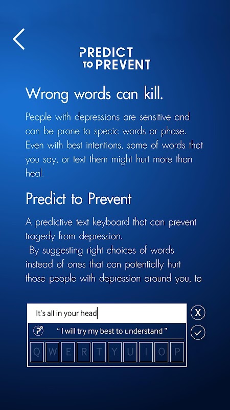 Dự đoán ĐỂ NGĂN CHẶN bàn phím sử dụng một hàm Đoán trước văn bản để phát hiện những lời có hại hay thậm chí là những lời tốt ý định có khả năng làm tổn thương người với những cảm xúc trầm cảm, và đề nghị lựa chọn đúng đắn của các từ để ngăn chặn một sự giải thích tiêu cực mà có thể trở thành nguyên nhân của tự hại hoặc tự sát .