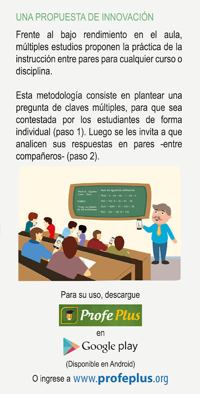ProfePlus tạo điều kiện cho việc thực hiện phương pháp "hướng dẫn đồng đẳng" trong lớp học của khóa học bất kỳ. Phương pháp này đã được tạo ra bởi Tiến sĩ Eric Mazur (Đại học Harvard) trong hơn hai thập kỷ trước và đã được áp dụng rộng rãi trong nhiều trường đại học ở các nước khác nhau. Nhờ những đóng góp của họ trong việc cải thiện giảng dạy, TS Mazur đã được vinh danh với giải thưởng danh giá vào năm 2014 Minerva.