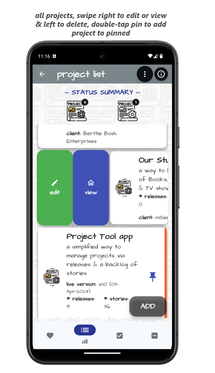 Vuốt mục hiện có sang phải để chỉnh sửa chi tiết đã nhập trước đó hoặc để xem dự án, vuốt sang trái để xóa dự án và tất cả các bản phát hành và danh sách tồn đọng liên quan.