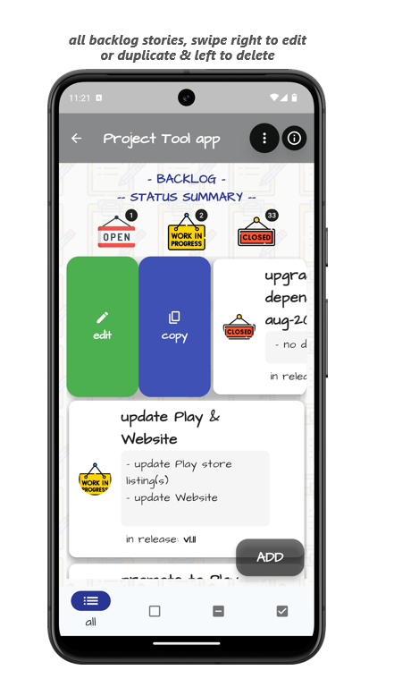 Vuốt mục hiện có sang phải để chỉnh sửa chi tiết đã nhập trước đó hoặc để sao chép câu chuyện, vuốt sang trái để xóa câu chuyện.