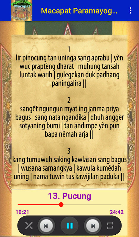 Ứng dụng của Javan Pupuh (Macapat): Paramayoga 1-15 được cung cấp cho những người hâm mộ văn hóa Java - đặc biệt là cho những người hâm mộ nghệ thuật Java truyền thống hoặc nghệ thuật Java cổ đại. Ứng dụng này chứa những bài thơ từ sợi Paramayoga 1 đến 15 đã được phát triển. Bài thơ Java phát triển này được gọi là bài hát macapat.