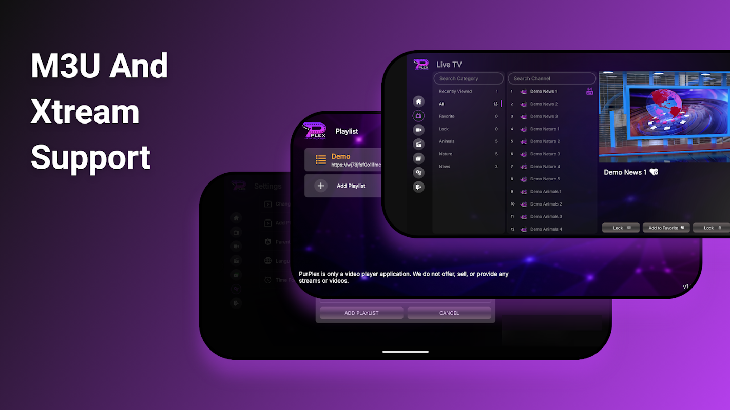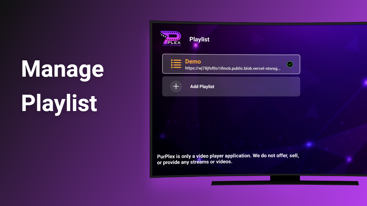 Lưu ý quan trọng: PurPlex IPTV Player là trình phát video và không cung cấp bất kỳ nội dung nào. Bạn phải thêm danh sách phát của riêng mình để truyền phát nội dung.