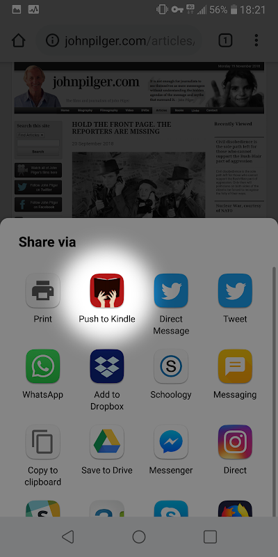 Once installed you will see 'Push to Kindle' as an option when you choose to share a web page (Share page > Push to Kindle). Select it to send the article.