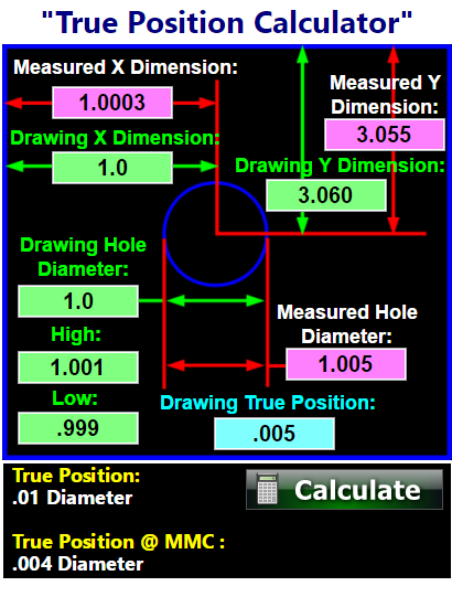 Quickly and Easily Calculate the True Position of Holes in Relation to the Blueprint Datums. Both Basic True Position and True Position at Maximum Material Condition MMC are calculated. This is a great APP for Machine Shop QC Inspectors, CNC Machinists, Manual Machinists, Toolmakers, Mold Makers and anyone needing to calculate the True Position of a machined part.
