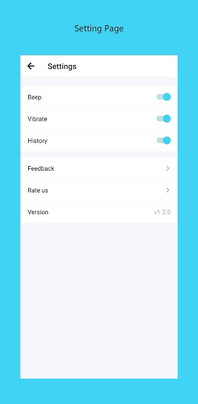 4. In the settings, you can set the sound switch and vibration switch of QR Scanner & Barcode Scanner.