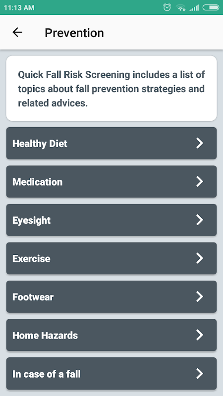 The Quick Fall Risk Screening App was developed in the scope of the FallSensing project, which aims to create technological solutions that allow fall risk evaluation in adult population, and implement fall prevention plans which contribute to healthy and active ageing.