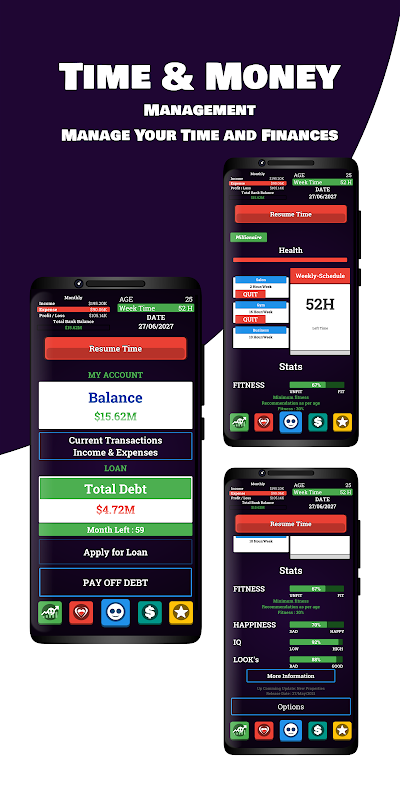 Người chơi có 80 giờ mỗi tuần. Làm thế nào để bạn quản lý những giờ đó để kiếm tiền là một thách thức. Vì vậy, hãy sử dụng thời gian của bạn một cách khôn ngoan, nếu không bạn sẽ phá sản. Giống như trong cuộc sống thực, bạn phải chăm sóc các chỉ số của mình như sức khỏe, thể lực, Hạnh phúc, ngoại hình và IQ. Hầu như mọi hành động bạn thực hiện trong trình mô phỏng này sẽ ảnh hưởng đến các chỉ số đó và các chỉ số đó sẽ ảnh hưởng đến chất lượng cuộc sống