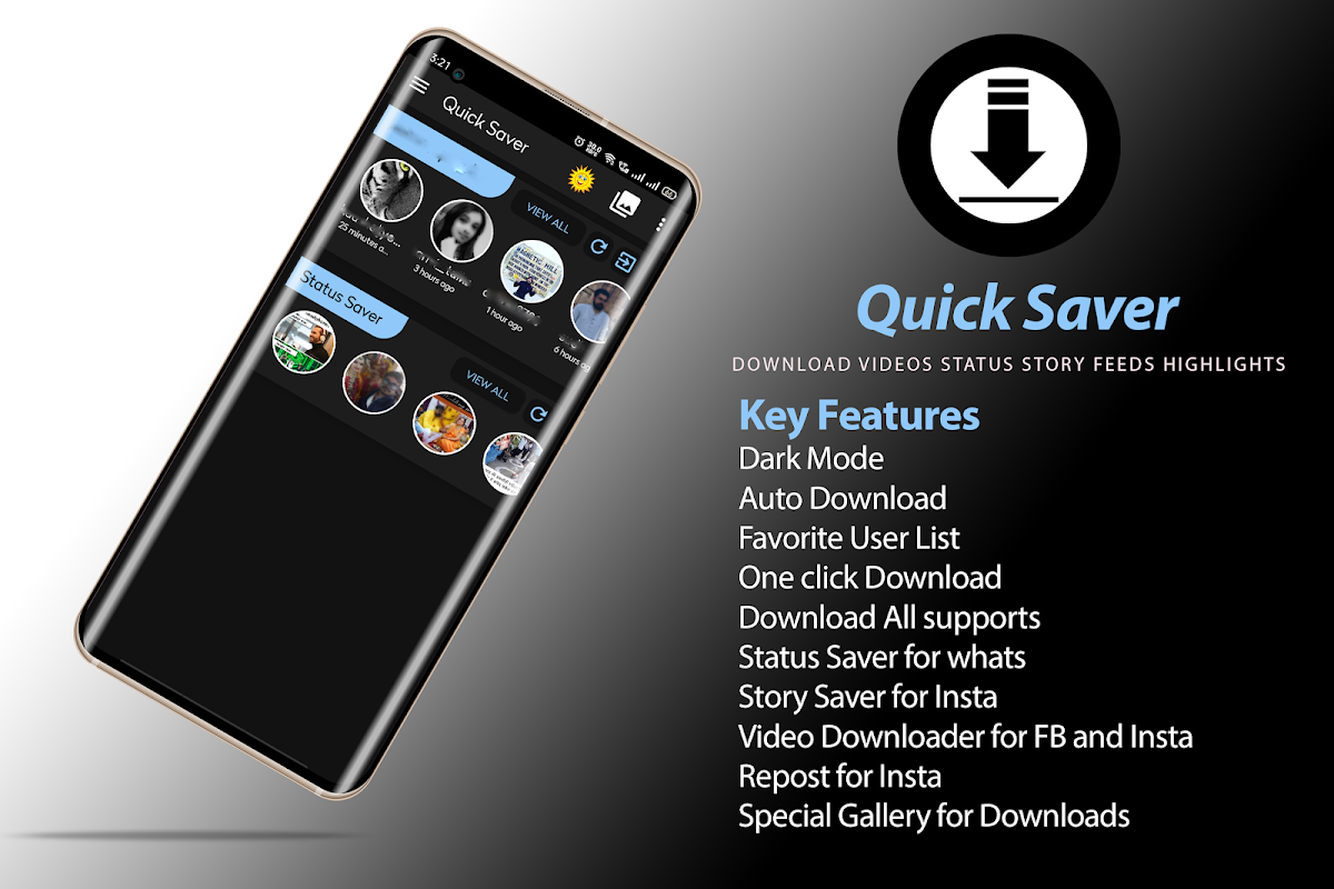 Using Quick saver Easily download Instagram Story, WhatsApp Status, DP, Instagram Public feeds, Facebook videos, TikTok Videos directly from the Internet onto your device. 100% free!