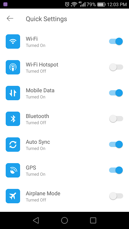 Nó có một mục nhập nhanh cho 11 cài đặt hệ thống điện thoại bao gồm mạng, Bluetooth, GPS, độ sáng, v.v.