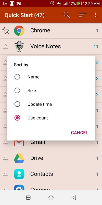 Tự động sắp xếp theo tên, kích thước, thời gian cập nhật hoặc số lượng sử dụng