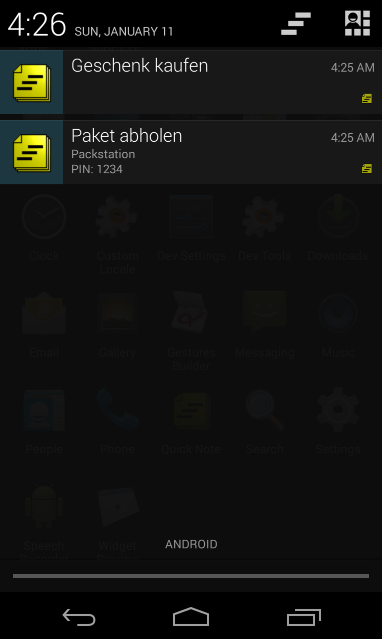 Die App dient dazu, schnell kurze Notizen in die Status-Leiste (Notification-Bar) des Handys zu senden, für die man nicht gleich einen Kalender- oder ToDo-Listeneintrag erstellen will. So entfällt auch das lästige "Weiterklicken" wenn die Aufgabe noch nicht erfüllt ist. Einfach erledigen und dann "rauswischen". Die Einträge bleiben natürlich auch nur bis zum Neustart des Handys erhalten.