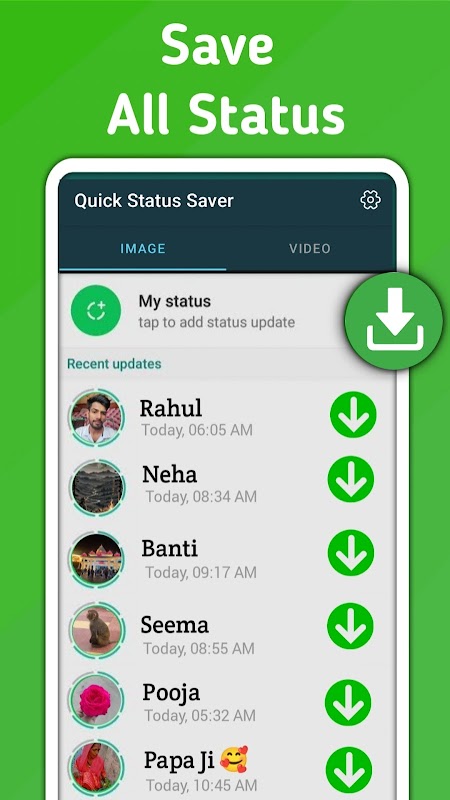 Quick Status Saver cho phép bạn dễ dàng tải xuống và lưu hình ảnh và video trạng thái được chia sẻ bởi những người liên hệ của bạn. Với thiết kế đơn giản và thân thiện với người dùng, bạn có thể quản lý và chia sẻ lại các cập nhật trạng thái ngoại tuyến bất cứ lúc nào.