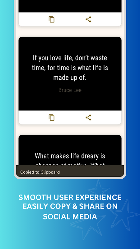 3. Tùy chọn sao chép và chia sẻ trên mạng xã hội dễ dàng: Chia sẻ nhanh chóng các trích dẫn chỉ bằng một cú chạm, lý tưởng cho chú thích trên Instagram, bài đăng trên Facebook và cập nhật trạng thái WhatsApp. Hoặc sử dụng tính năng sao chép để lưu báo giá cho lần sau.