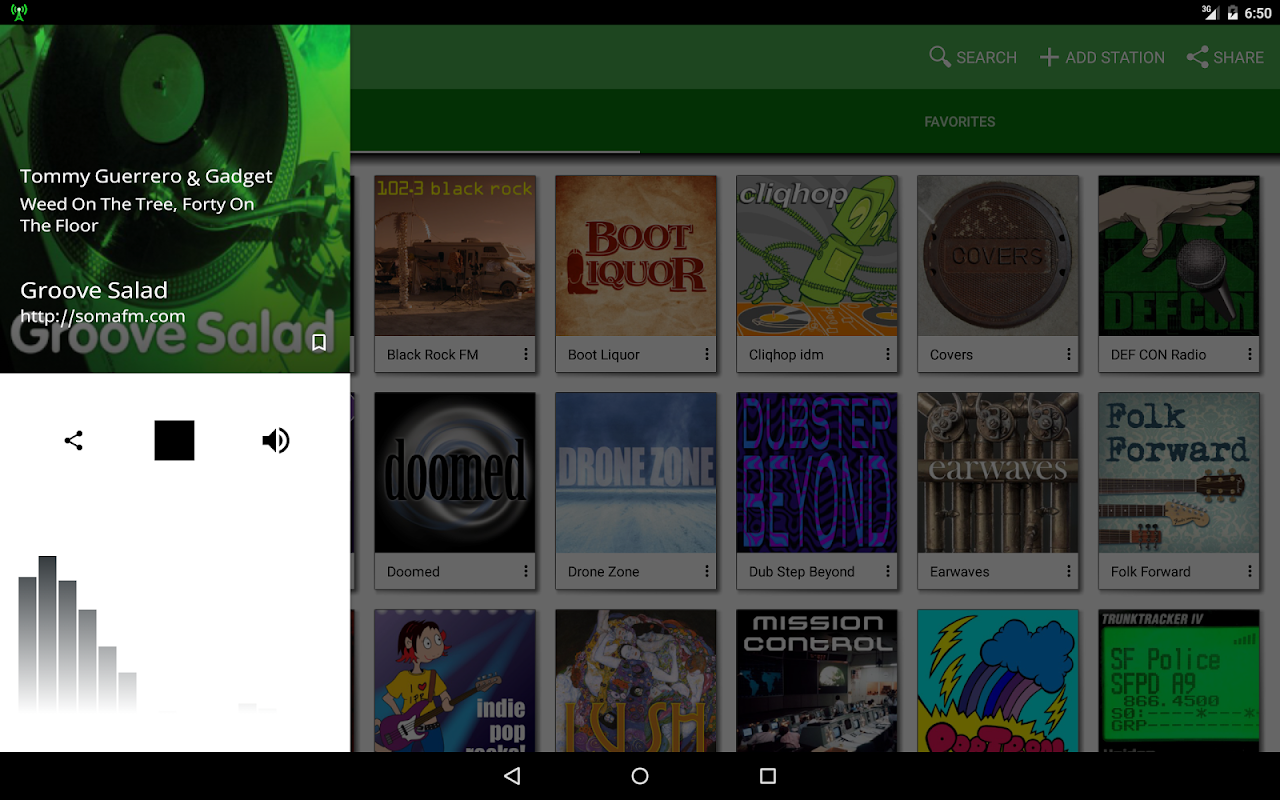 Player for online radio stations with preselected high-quality music streams.