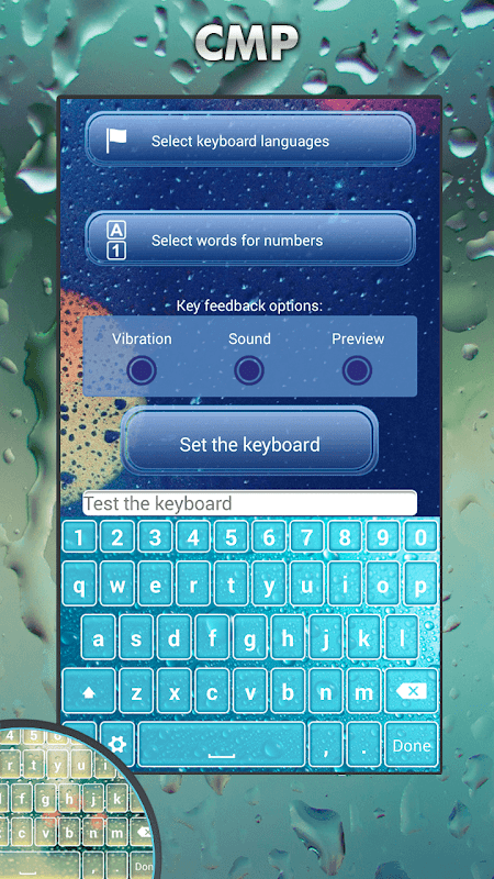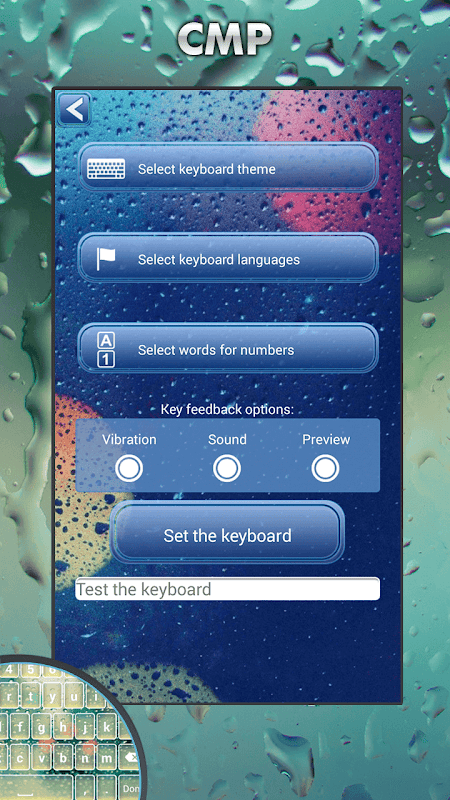 - Quay trở lại các ứng dụng và chọn "Cài đặt bàn phím để mặc định" nút, và chọn Mưa Bàn phím Chủ đề.