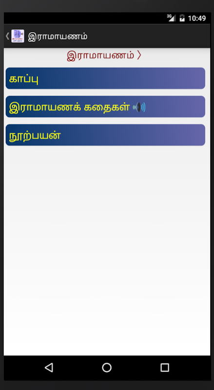 This app includes story of Ramayana in Tamil, split into 6 audio files.