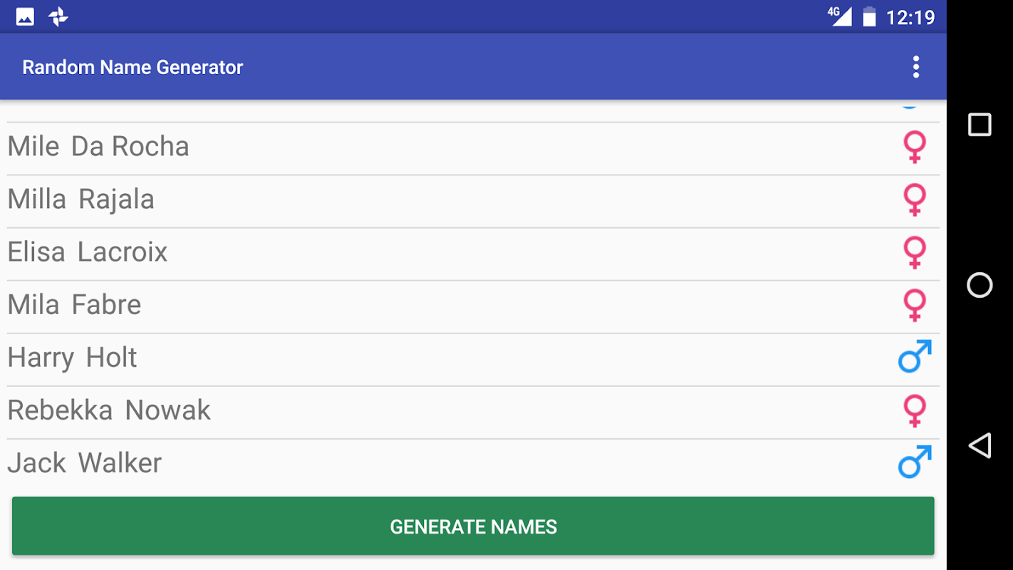 máy phát điện tên ngẫu nhiên này sẽ tạo ra cái tên ngẫu nhiên và địa chỉ từ nhiều quốc tịch khác nhau. Bạn cũng có thể chọn giới tính của những cái tên được tạo ra và sao chép tên vào clipboard Android.