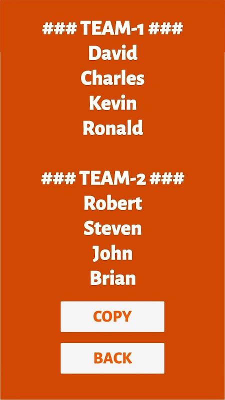 The user enters desired names with commas between them. After pressing the “Start” button, the names in the teams are selected randomly by the application. After the user press the “Copy” button, randomly generated team lists are copied to the clipboard.