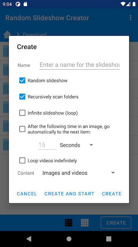 Ứng dụng cho phép bạn tạo và xem trình chiếu ảnh và video từ bất kỳ (và nhiều) tệp và thư mục nào trong điện thoại của bạn. Phiên bản cao cấp cũng cho phép bạn chỉ định các tệp và thư mục trong PC của mình thông qua SMB.