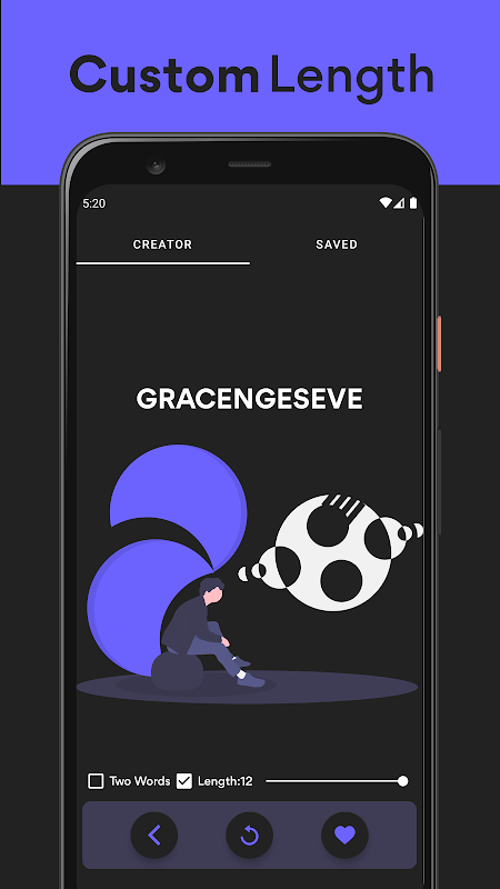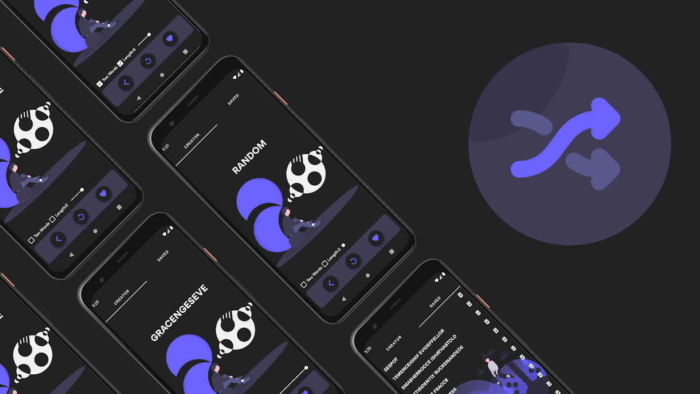 Ứng dụng cho phép bạn tạo các từ ngẫu nhiên theo ý thích của mình, độ dài từ có thể được điều chỉnh tối đa tám ký tự trong khi hỗ trợ 2 từ cùng một lúc. Người dùng có thể yêu thích các từ.