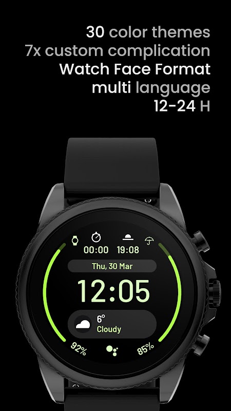 Mặt đồng hồ Wear OS thân thiện với pin. Nhiều phong cách màu sắc và các biến chứng tùy chỉnh.
