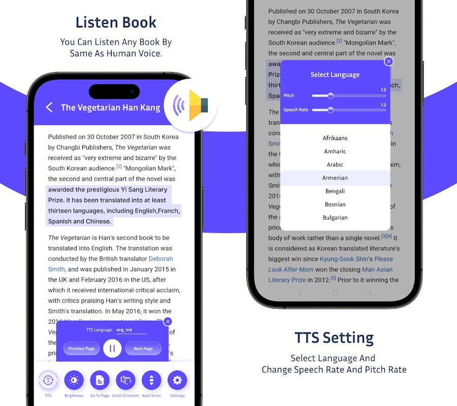 - Thay đổi ngôn ngữ yêu thích của bạn để nghe sách PDF.