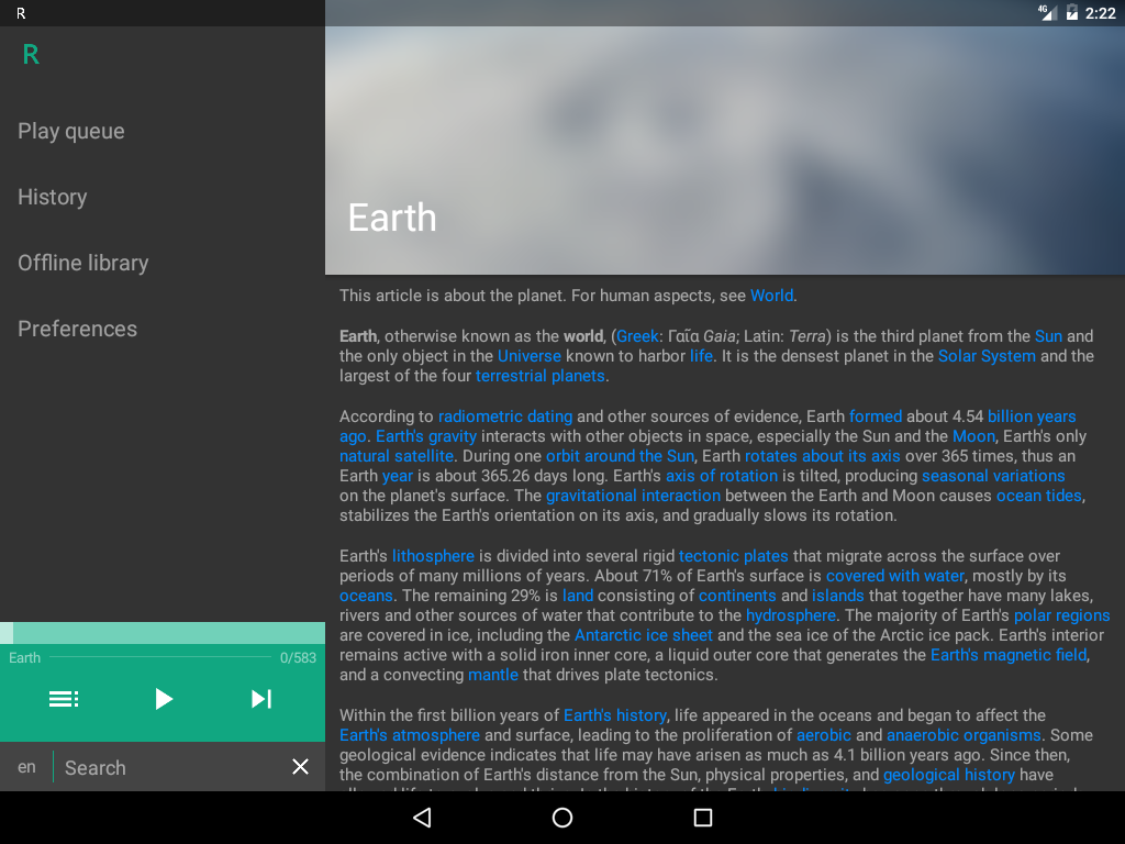 Play Wikipedia™ articles with Text to Speech (TTS) using this music player-like app. Use the play queue and offline mode features to always have content to listen to.