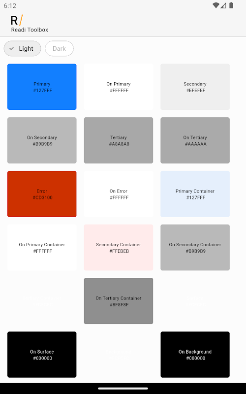 Colors used in Readi apps: light and dark theme overview