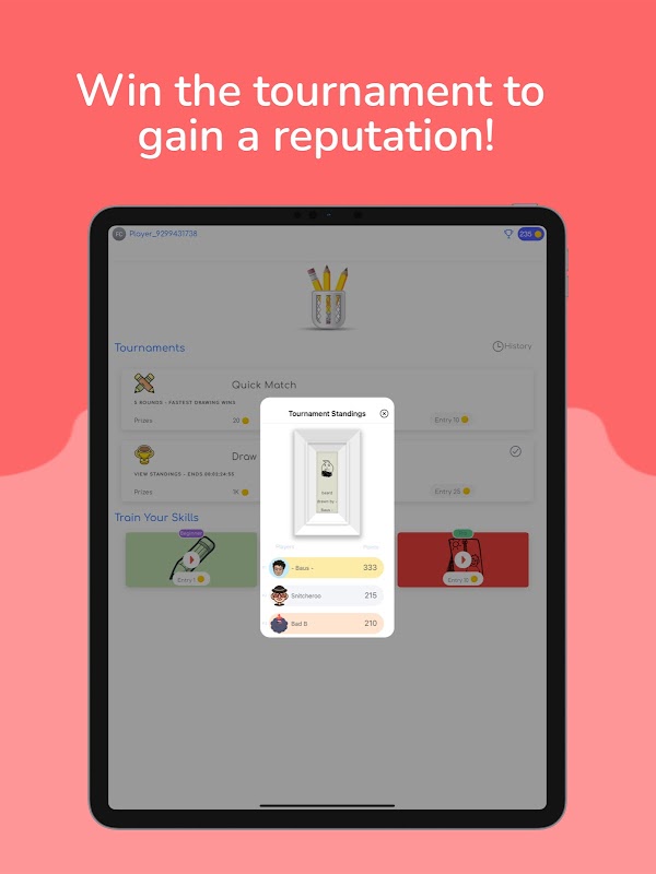 Participate in weekly tournaments where the best drawing is showcased and gains 1000XP and 1000 gold.