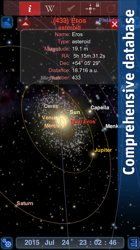 • Comprehensive database: Browse more than 100,000 stars, 70,000 spectacular deep sky objects, 500 asteroids, 16 comets and 26 moons as well as all planets and dwarf planets.