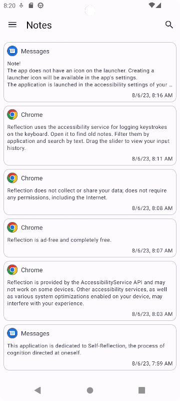· Reflection sử dụng dịch vụ trợ năng để ghi lại các lần gõ phím trên bàn phím. Mở nó để tìm ghi chú cũ. Lọc chúng theo ứng dụng và tìm kiếm theo văn bản. Kéo thanh trượt để xem lịch sử nhập của bạn.