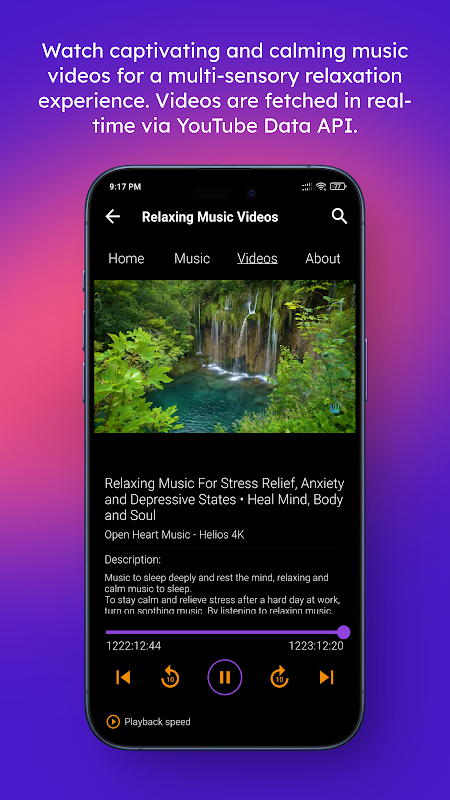 Xem các video ca nhạc hấp dẫn và êm dịu để có trải nghiệm thư giãn đa giác quan. Video được tải theo thời gian thực nên bạn luôn có nội dung mới để thưởng thức. Dễ dàng chuyển đổi giữa chế độ âm thanh và video để có trải nghiệm phù hợp.