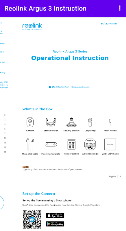 Reolink Argus 3 Hướng dẫn ở định dạng PDF.
