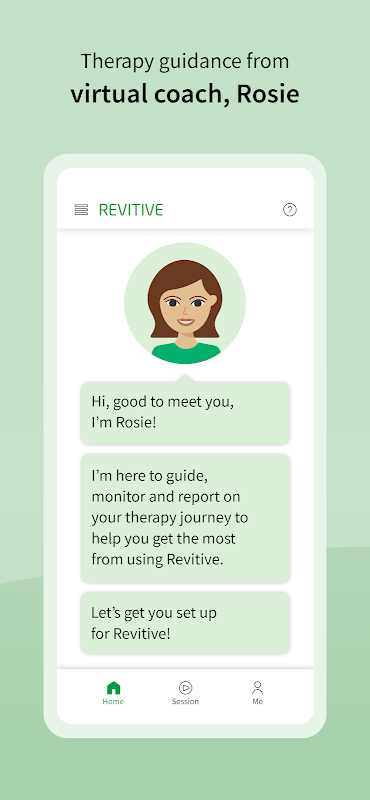 Revitive Medic Coach kích thích các cơ ở chân và bàn chân của bạn bằng cách sử dụng Kích thích cơ điện (EMS) để tăng cường tuần hoàn. Sử dụng ứng dụng được kết nối với Medic Coach, bạn có thể tạo kế hoạch trị liệu phù hợp với các triệu chứng ở chân của mình. Rosie, Huấn luyện viên trị liệu ảo của bạn, sẽ giúp bạn đi đúng hướng và tận dụng tối đa các buổi trị liệu của mình.