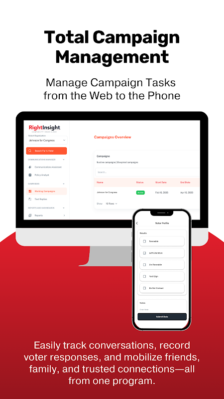 Thông qua các công cụ vận động tranh cử dựa trên bản đồ và gọi điện thoại đơn giản, ngay cả những tình nguyện viên ít am hiểu công nghệ nhất cũng sẽ làm việc dễ dàng. Khi bạn kết hợp ứng dụng của chúng tôi với hệ thống CRM đẳng cấp thế giới, bạn có quyền truy cập vào thông tin thời gian thực giúp bạn lập kế hoạch chiến lược và theo dõi tình trạng của từng cử tri. Bạn có thể điều chỉnh hành động một cách linh hoạt đến từng cá nhân dựa trên các tiêu chí cụ thể.