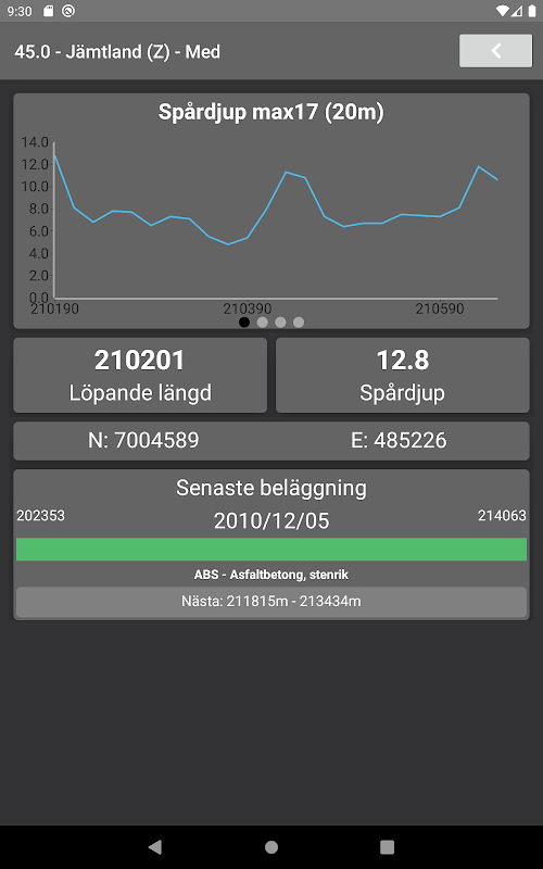 Bây giờ bạn có thể dễ dàng xem dữ liệu mặt đường và đo lường mới nhất cho con đường bạn đang đi. Trình phân tích đường hiển thị dữ liệu từ API mở của Cục giao thông Thụy Điển dựa trên vị trí GPS. Ứng dụng lấy dữ liệu liên tục khi bạn di chuyển dọc đường. Trình phân tích đường cho thấy thông tin về công việc lát gần đây nhất, chiều dài chạy, độ sâu theo dõi, IRI, độ sâu cạnh và độ dốc đáy theo dõi.