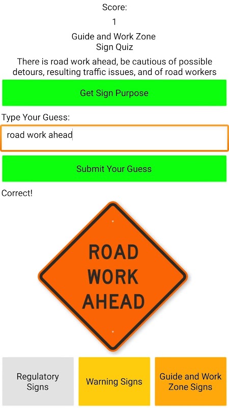 With this app, you can learn and test your knowledge on the different road signs that will be needed for both your Learner's Permit test and for regular road usage.