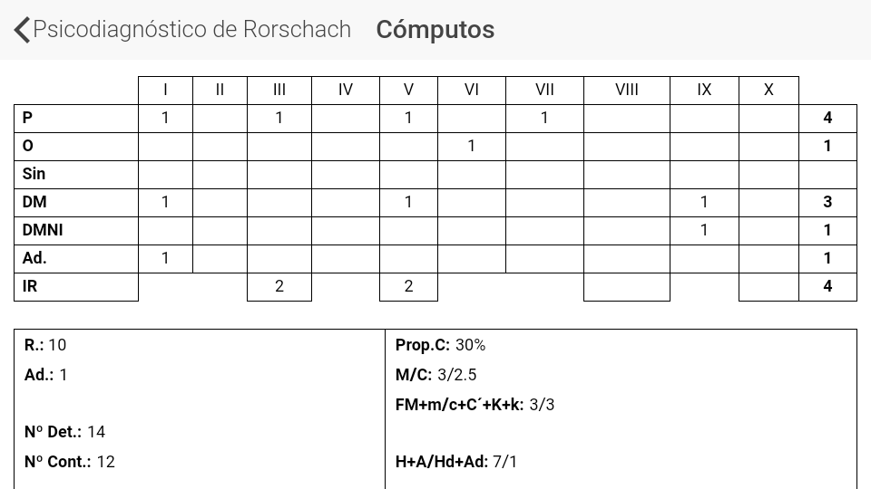 RoApp resuelve los cálculos de la Hoja de cómputos automáticamente a partir de la clasificación introducida por el usuario, quien podrá luego enviarse el protocolo completo del Psicodiagnóstico de Rorschach por e-mail para su posterior edición (con Word), archivo o impresión utilizando una computadora de escritorio (PC o notebook).