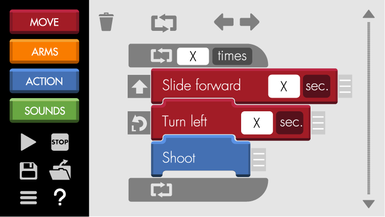 Tìm hiểu chương trình robot một cách dễ dàng và trực quan bằng các khối với App tuyệt vời này. Burn chương trình của bạn để lặp lại nhiều lần như bạn muốn, làm cho robot của bạn phát ra tất cả các loại âm thanh, các vòng lặp và sắp xếp các khối chương trình của bạn như bạn muốn. Bạn cũng có thể kiểm soát tất cả các phong trào và hoạt động của robot của bạn, vì màn hình thiết bị di động sẽ trở thành một lệnh tương tác với các tính năng tương tự như điều khiển từ xa. Tương thích với Robotron, Robotron Robotron Mini và Mini trực quan Programmable Blocks.