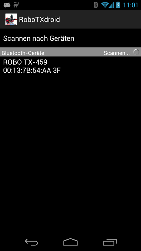 RoboTXdroid sử dụng khả năng chuyển động của điện thoại cảm ứng. mô hình Fischertechnik® có thể đi sang trái / phải nếu điện thoại thông minh có thể xoay sang trái / phải hoặc đi tiếp / ngược nếu smartphone được hạ xuống / di chuyển lên trên. Các phím mềm "lên" / "xuống" kích hoạt đầu ra O5 / O6. Lúc khởi động, xin vui lòng có một cái nhìn tại các hướng dẫn.